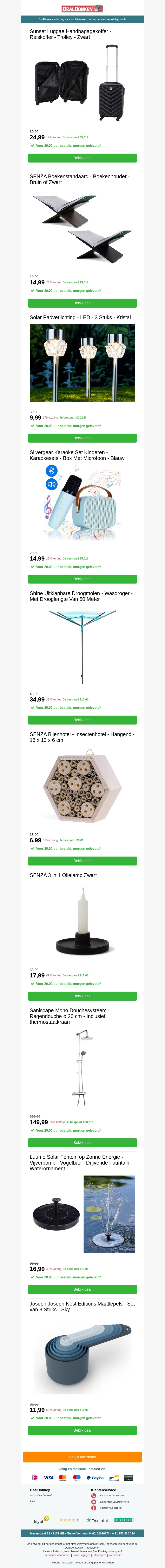 Bekijk onze nieuwste kortingen op een Sunset Luggage handbagage koffer, een kindvriendelijke karaoke set, een handige droogmolen en een bijenhotel. Mis ook de regendouche voor ultiem comfort. Zorg dat je profiteert van deze fantastische deals!