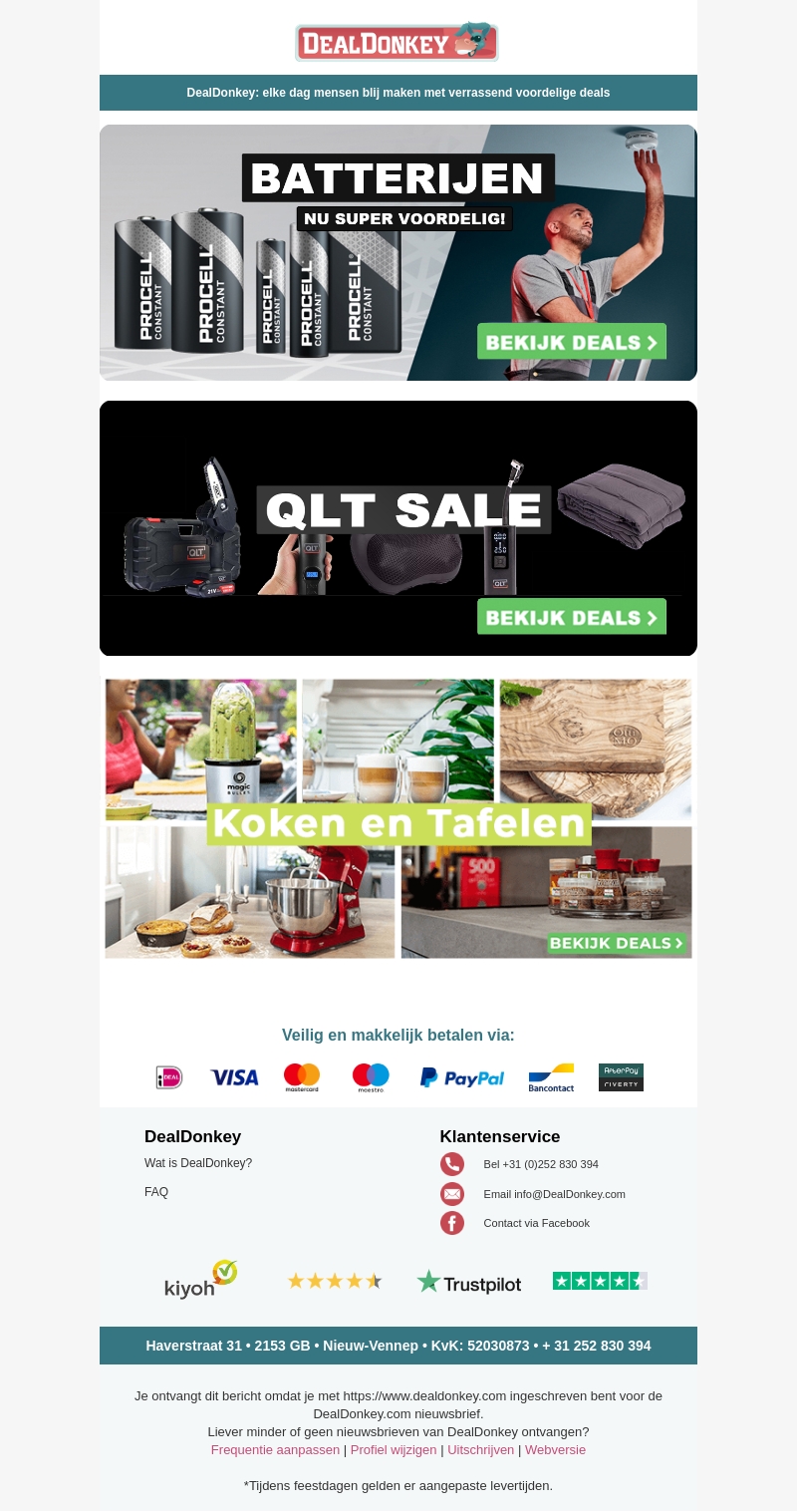 Deze nieuwsbrief van DealDonkey biedt geweldige aanbiedingen op batterijen, koken en tafelen, en QLT producten. Ontdek onmisbare kortingen en profiteer van geweldige deals op hoogwaardige producten. Mis deze kans niet om te besparen op de beste items voor jouw huis. Winkel nu veilig en gemakkelijk met vertrouwde betalingsopties. Ontvang extra voordelen tijdens de feestdagen.