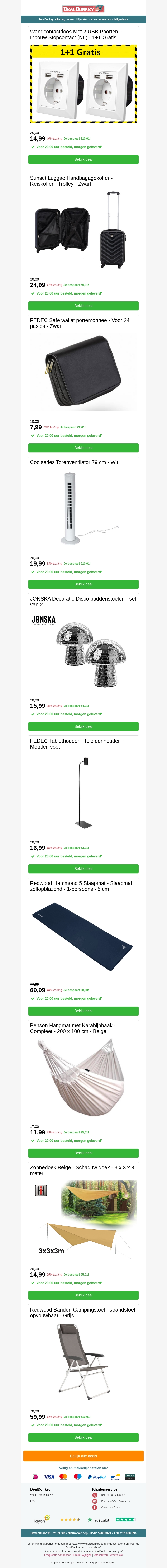 Mis deze geweldige aanbiedingen niet! Scoor een wandcontactdoos met USB-poorten, torenventilator, handige tablethouder, comfortabele hangmat en een groot zonnedoek. Shop nu en profiteer van 1+1 gratis deals en scherpe kortingen.
