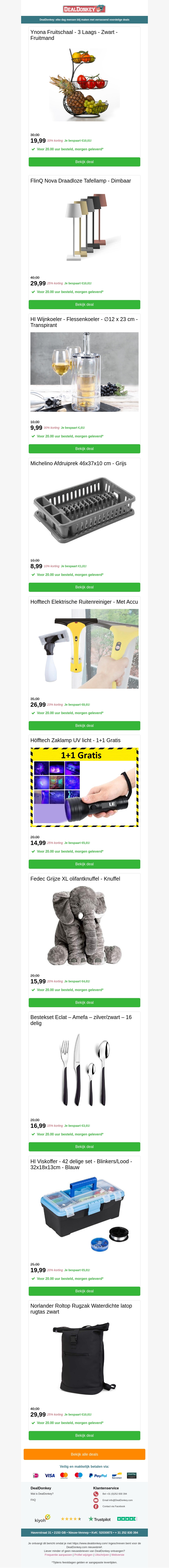 Bekijk onze nieuwste aanbiedingen, waaronder een stijlvolle fruitschaal, handige wijnkoeler, schattige olifant knuffel, elegante bestekset en een praktische rugzak. Allemaal verkrijgbaar tegen scherpe prijzen. Profiteer nu van deze geweldige deals en bestel vandaag nog!