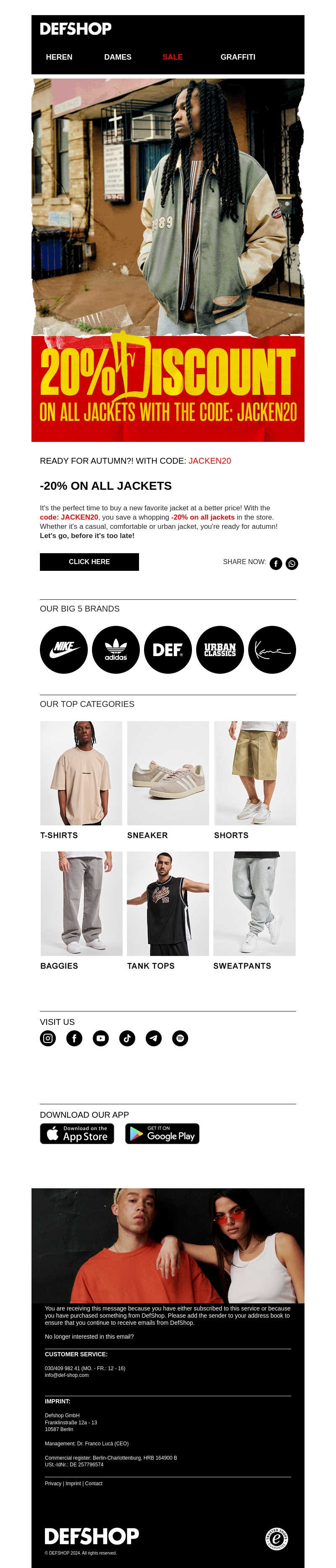 Bereid je voor op het herfstseizoen met een geweldige aanbieding van DefShop! Krijg 20% korting op alle jassen in de boutique. Gebruik de code JACKEN20 bij het afrekenen om van de korting te profiteren. Mis deze kans niet om stijlvolle, comfortabele jassen te scoren voor minder.