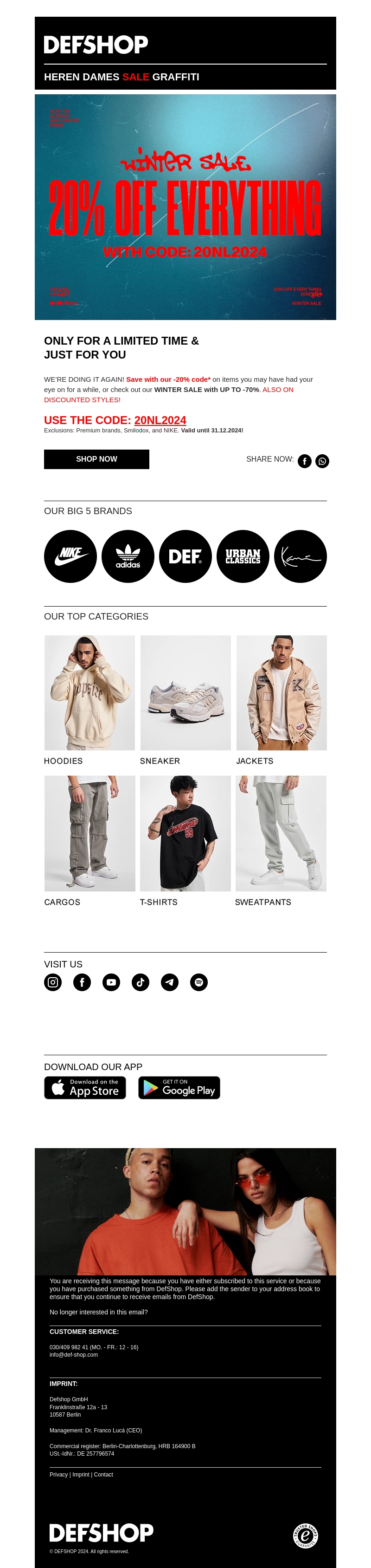 Vandaag kun je profiteren van een exclusieve korting van 20% op alles in de winteruitverkoop bij DefShop. Gebruik de code 20NL2024 en shop de laatste stijlen voor heren en dames. Ontdek topmerken zoals Nike, Adidas en meer. Mis deze unieke kans niet, de actie is kort geldig!