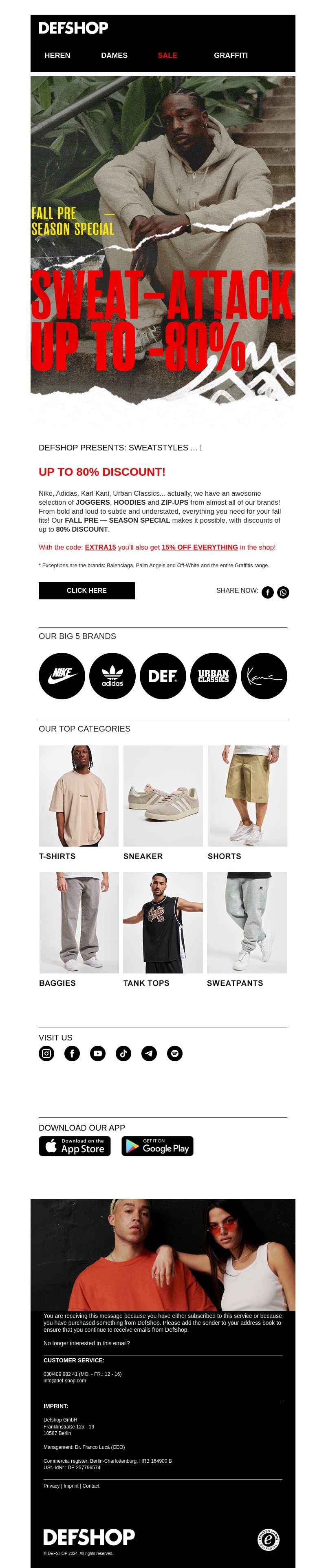 Bereid je voor op de herfst met DefShop's Fall Pre Season Special! Ontdek een geweldige selectie joggers, hoodies, en zip-ups van merken zoals Nike, Adidas, Karl Kani, Urban Classics en meer. Geniet van kortingen tot 80% en bespaar nรณg meer met de code EXTRA15 voor een extra 15% korting. Mis het niet!