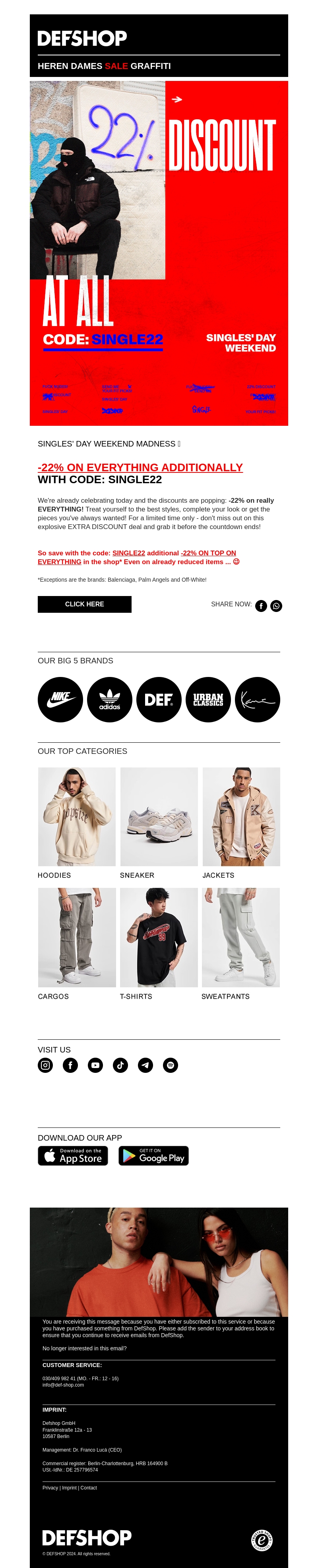 Vier Singles' Day met DefShop en profiteer van 22% korting op echt alles! Gebruik de kortingscode SINGLE22 bij je aankoop. Haast je, want deze actie geldt maar tijdelijk. Verwen jezelf met de nieuwste stijlen van je favoriete merken. Sla nu je slag in onze winkel.