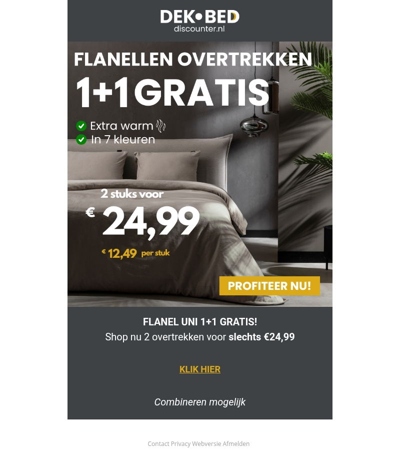 Profiteer nu van de 1+1 gratis actie op flanellen overtrekken bij Dekbed Discounter. Geniet van extra warme comfort in de winter met deze zachte overtrekken. Nu te krijgen in 7 prachtige kleuren. Bestel nu twee stuks voor slechts β¬24,99 en bespaar nog meer. Combineer naar hartenlust en kies de kleuren die het beste in jouw interieur passen.