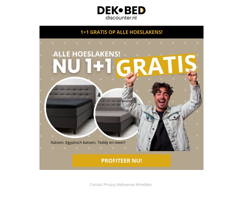 Ontvang nu een geweldige aanbieding bij Dekbed Discounter: 1+1 gratis op alle hoeslakens! Kies uit diverse materialen zoals katoen, Egyptisch katoen, Teddy en meer. Mis deze kans niet en vernieuw je beddengoed met hoge kwaliteit hoeslakens. Profiteer direct!