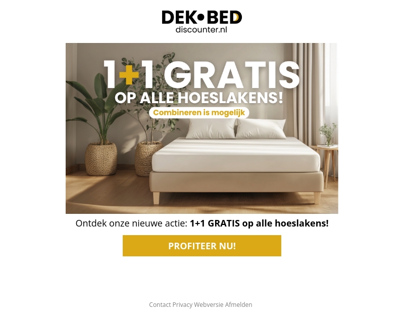 Dekbed-Discounter lanceert een speciale aanbieding: koop ÊÊn hoeslaken en ontvang de tweede gratis. De actie geldt voor alle hoeslakens en combinaties zijn mogelijk. Mis deze kans niet om je beddengoed collectie voordelig uit te breiden. Bezoek onze website om deze promotie te benutten. Ervaar het comfort van onze hoogwaardige hoeslakens. Profiteer nu!