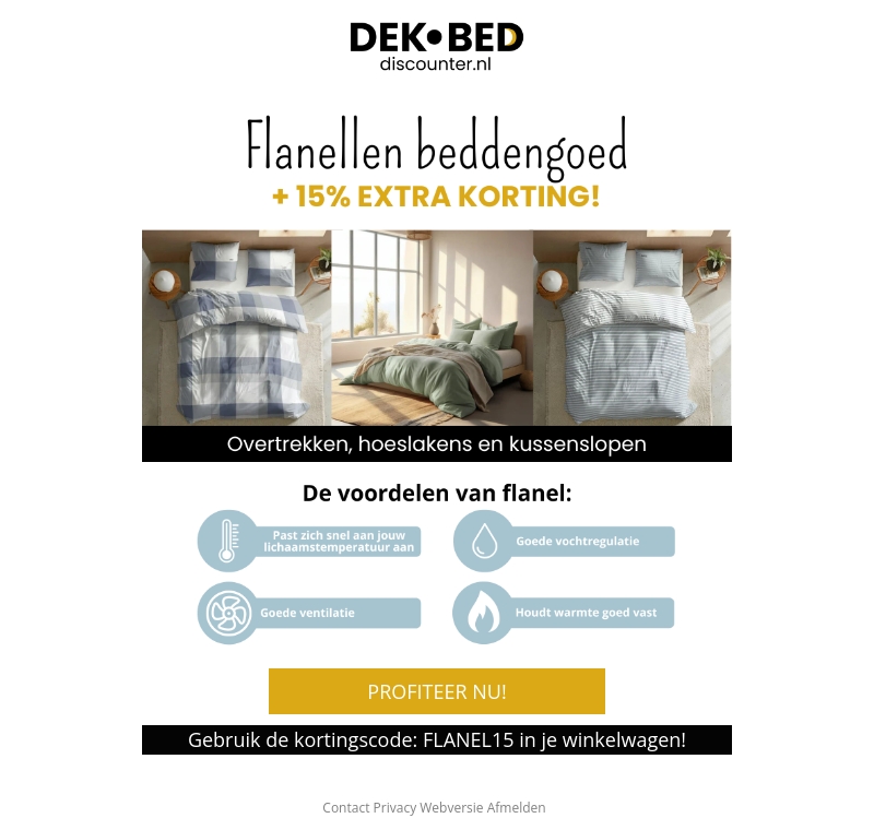 Profiteer van 15% korting op ons flanellen beddengoed bij DEKβ’BED Discounter. Onze flanellen lakens passen zich snel aan aan je lichaamstemperatuur, bieden goede ventilatie en vochtregulatie. Gebruik de kortingscode FLANEL15 in je winkelwagen om van deze aanbieding te genieten.