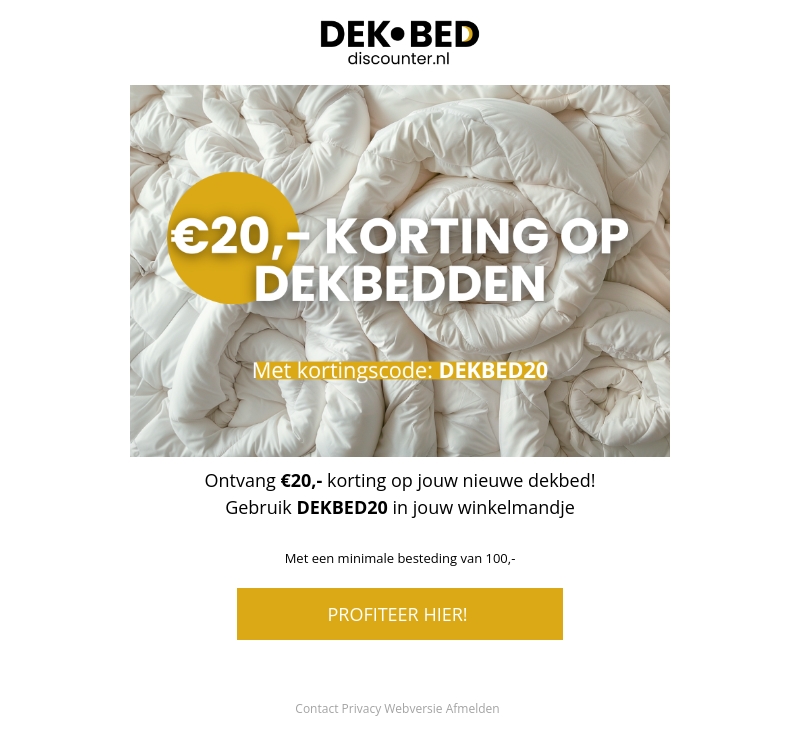 Ontvang €20,- korting op jouw nieuwe dekbed! Gebruik de kortingscode DEKBED20 in jouw winkelmandje. Het aanbod geldt bij een minimale besteding van €100,-. Mis deze kans niet en geniet van een heerlijke nachtrust met onze comfortabele dekbedden. Profiteer nu!