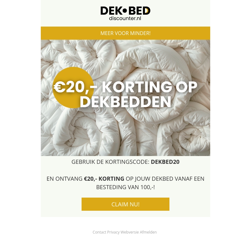 Mis deze geweldige aanbieding van Dekbeddiscounter.nl niet! Krijg €20,- korting op jouw aankoop van dekbedden bij een minimale besteding van €100,-. Gebruik de kortingscode DEKBED20 en geniet van een comfortabele nachtrust voor minder geld. Deze actie is tijdelijk, dus sla snel je slag!