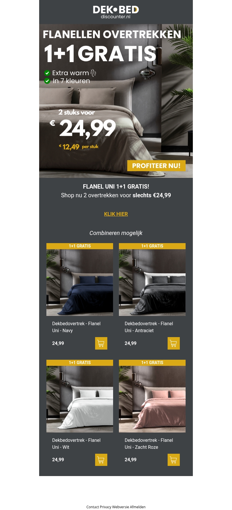 Profiteer van de geweldige aanbieding op flanellen dekbedovertrekken: 1+1 gratis! Verkrijgbaar in 7 kleuren, perfect voor extra warme nachten. Koop 2 stuks voor slechts €24,99. Combineer verschillende kleuren en stijlen naar wens. Mis deze kans niet om je slaapkamer op te frissen met comfortabele en stijlvolle dekbedovertrekken. Bestel nu eenvoudig online!