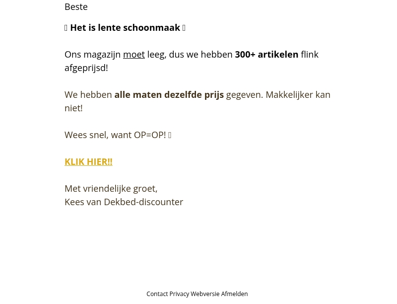 Ons magazijn moet leeg en daarom zijn er meer dan 300 artikelen flink afgeprijsd. Elke maat heeft dezelfde prijs, dus eenvoudiger kan het niet! Wees er snel bij, want OP=OP! Klik nu om geweldige deals te scoren.