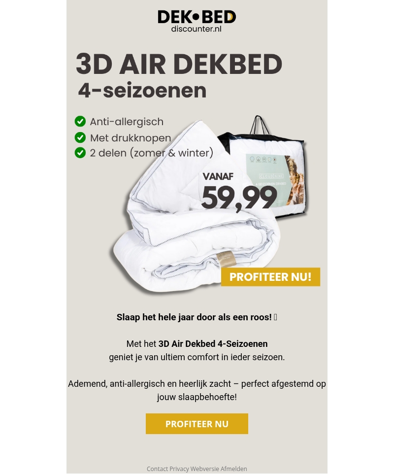 De prijzen van 3D Air Dekbedden zijn nu verlaagd. Ontdek het comfort van deze anti-allergische dekbedden met drukknopen voor flexibel gebruik het hele jaar door. Geniet van ademend materiaal dat perfect is voor zowel zomer als winter. Deze dekbedden zijn zacht en afgestemd op al jouw slaapbehoeften. Grijp je kans en koop nu voor een geweldige prijs.