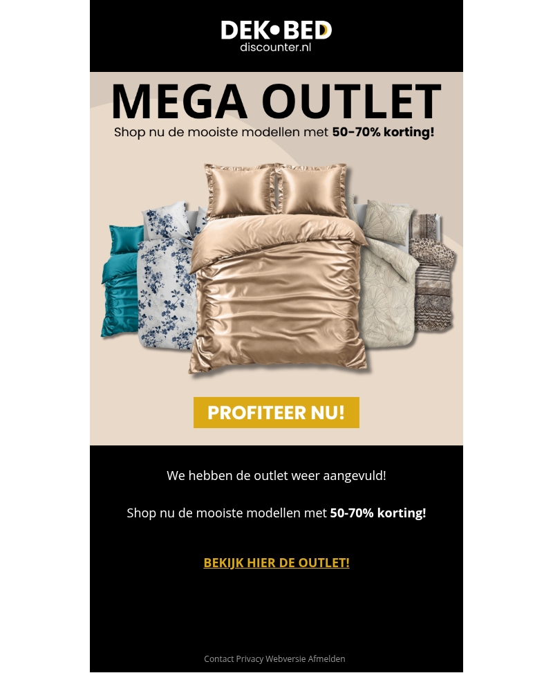 Bezoek de Mega Outlet van Dekbed Discounter en geniet van 50-70% korting op een breed scala aan prachtige dekbedmodellen. Het perfecte moment om uw slaapkamer in stijl en comfort te vernieuwen. Mis deze geweldige deals niet!