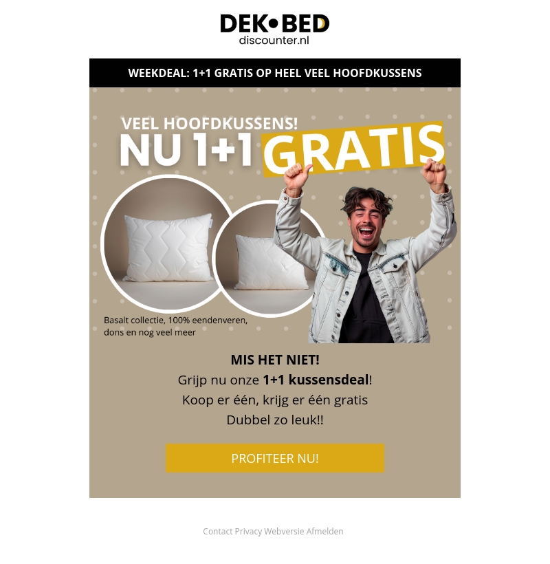 Mis het niet! Grijp nu onze 1+1 kussendeal. Koop er ÊÊn, krijg er ÊÊn gratis. Dubbel zo leuk! Deze aanbieding geldt voor de Basalt collectie, 100% eendenveren, dons en nog veel meer.
