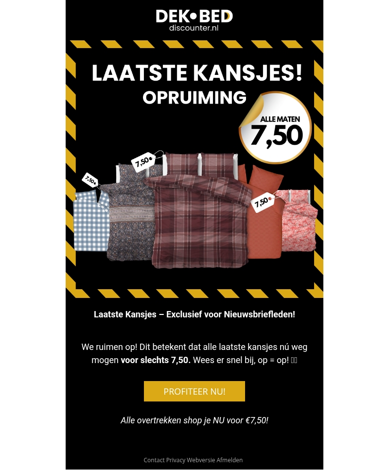 Profiteer van onze exclusieve opruiming! Alle laatste kansjes verkrijgbaar voor slechts β¬7,50. Deze aanbiedingen zijn exclusief voor nieuwsbriefleden. Zorg ervoor dat je snel bent, want op = op. Ontdek ons assortiment vandaag nog en sla je slag.