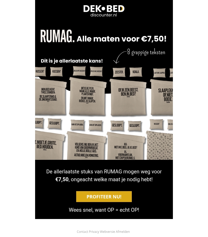 Grijp nu je kans om RUMAG producten te kopen voor slechts €7,50. Met een verscheidenheid aan grappige teksten zijn deze artikelen perfect voor elk bed. Wees snel, want OP=OP! Ontdek nu de humor en kwaliteit van RUMAG tegen een scherpe prijs.