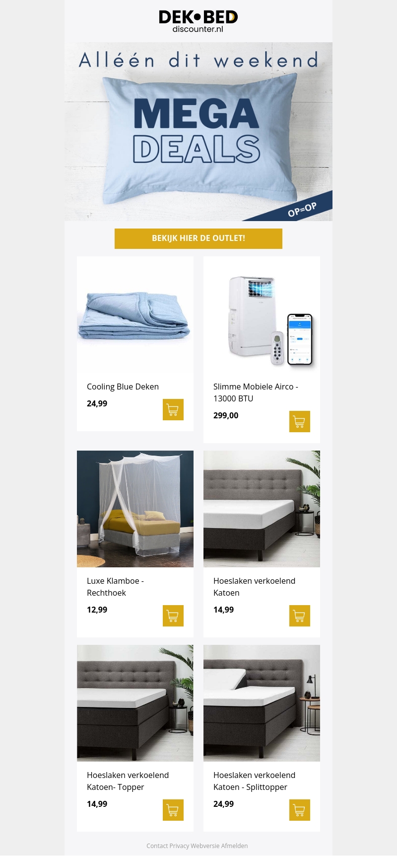 Mis deze unieke kans niet! Alleen dit weekend zijn onze top producten sterk in prijs verlaagd. Van luxe klamboes tot verkoelende hoeslakens en mobiele airco's, alles is nu extra voordelig.