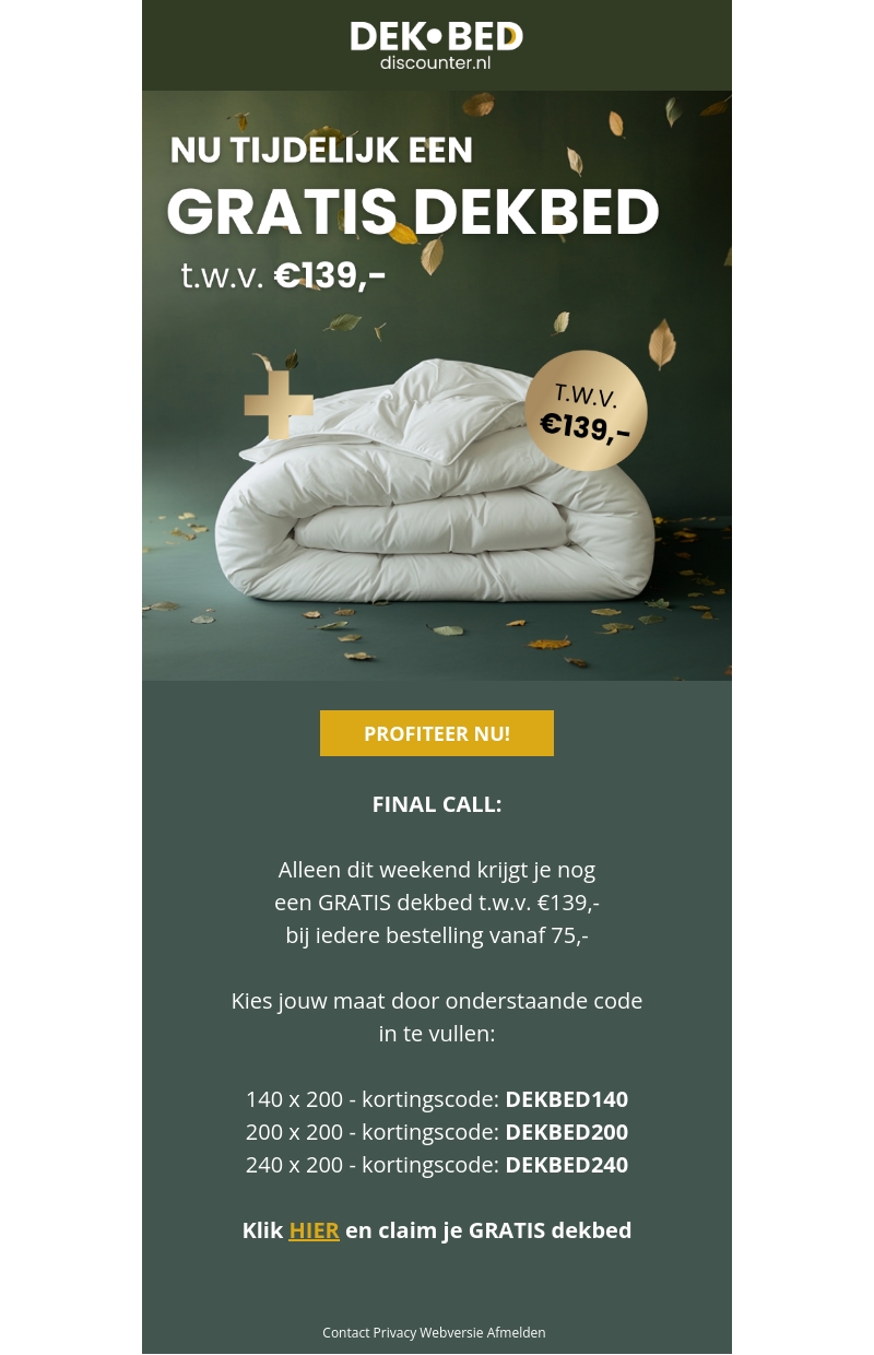 Dit weekend biedt Dekbed Discounter een exclusieve aanbieding. Ontvang een gratis dekbed ter waarde van β¬139 bij elke bestelling boven de β¬75. Kies de juiste maat en gebruik de bijbehorende kortingscode. Mis deze kans niet om je slaapcomfort te verbeteren.