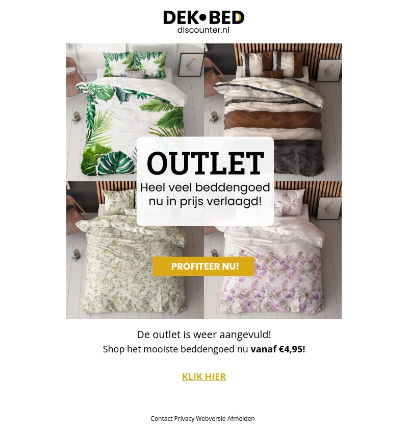 Bezoek onze outlet voor beddengoed en ontdek geweldige aanbiedingen. Met verlaagde prijzen vanaf slechts €4,95, kun je je slaapkamer een frisse nieuwe look geven zonder je budget te overschrijden. Onze collectie is bijgevuld met stijlvolle en comfortabele opties. Zorg ervoor dat je snel bent voordat de voorraad op is. Klik om de deals te bekijken en te profiteren. Mis het niet!