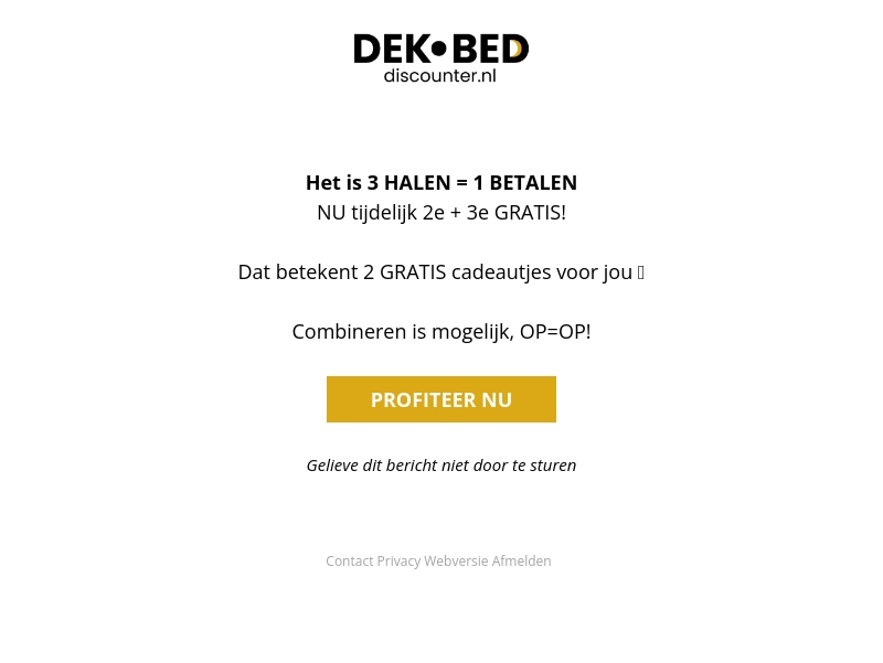 Dekbed Discounter biedt een speciale 3 halen, 1 betalen promotie aan. Bij aankoop van drie artikelen, betaal je nu slechts voor ÊÊn. Dit betekent dat je twee gratis cadeaus krijgt. Combineer verschillende producten, maar let op, op=op! Mis deze unieke kans niet en profiteer direct.