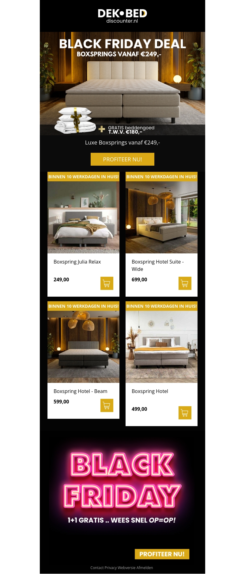 Ruim aanbod aan boxsprings tegen scherpe Black Friday tarieven! Ontvang luxe boxsprings vanaf slechts €249, inclusief gratis beddengoed ter waarde van €180. Snel geleverd binnen 10 werkdagen. Profiteer van de 1+1 gratis actie en kleed je slaapkamer stijlvol aan. Beperkte voorraad, dus wees er snel bij!