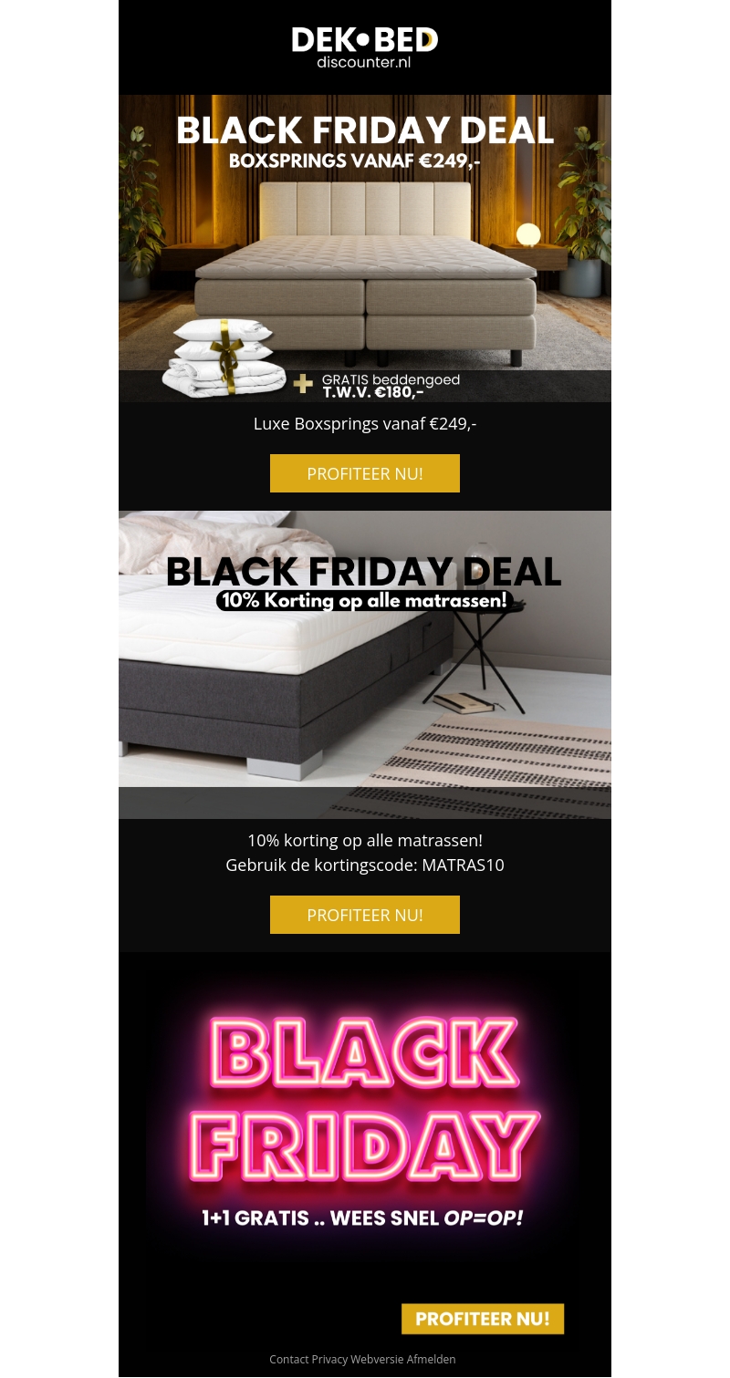 Profiteer van de ongeΓ«venaarde Black Friday deals bij Dekbed Discounter. Luxe boxsprings zijn nu verkrijgbaar vanaf slechts β¬249. Bovendien krijg je gratis beddengoed bij je aankoop. Maak gebruik van de kortingscode MATRAS10 voor 10% korting op alle matrassen. Er is ook een spectaculaire 1+1 aanbieding, dus wees er snel bij!