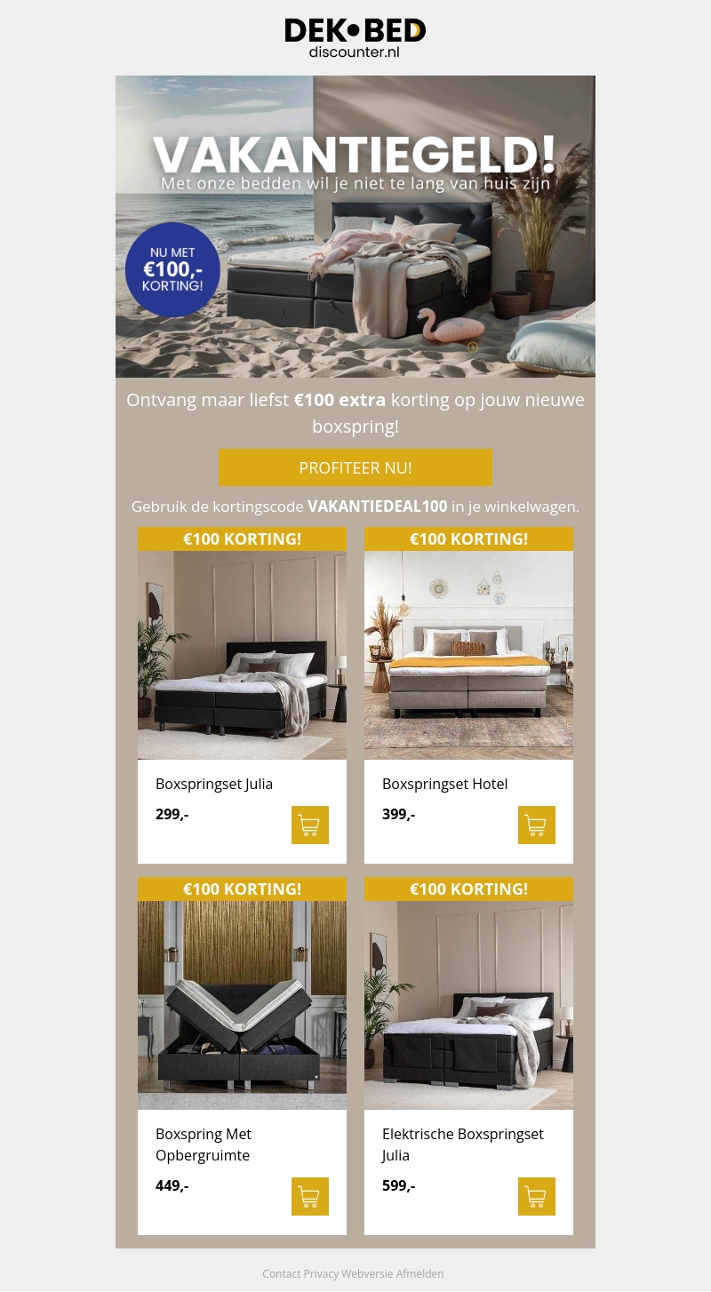 Ontvang deze zomer maar liefst €100 extra korting op jouw nieuwe boxspring bij Dekbed Discounter. Profiteer nu van deze vakantiegeldactie en bespaar op diverse boxspring modellen. Gebruik de kortingscode VAKANTIEDEAL100 in je winkelwagen.