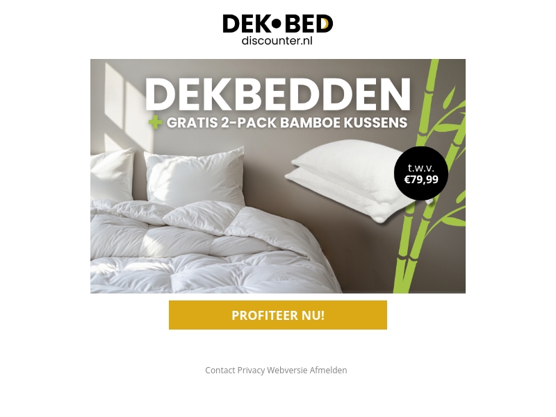 Nu is het perfecte moment voor een nieuw dekbed, vooral met de winter om de hoek. Ontdek onze luxe dekbedden en krijg een gratis 2-pack bamboe kussens bij aanschaf. Deze geweldige deal biedt ultiem comfort voor een scherpe prijs. Profiteer nu van deze speciale aanbieding en beleef een comfortabele nachtrust. De waarde van de kussens is €79,99. Grijp deze kans!
