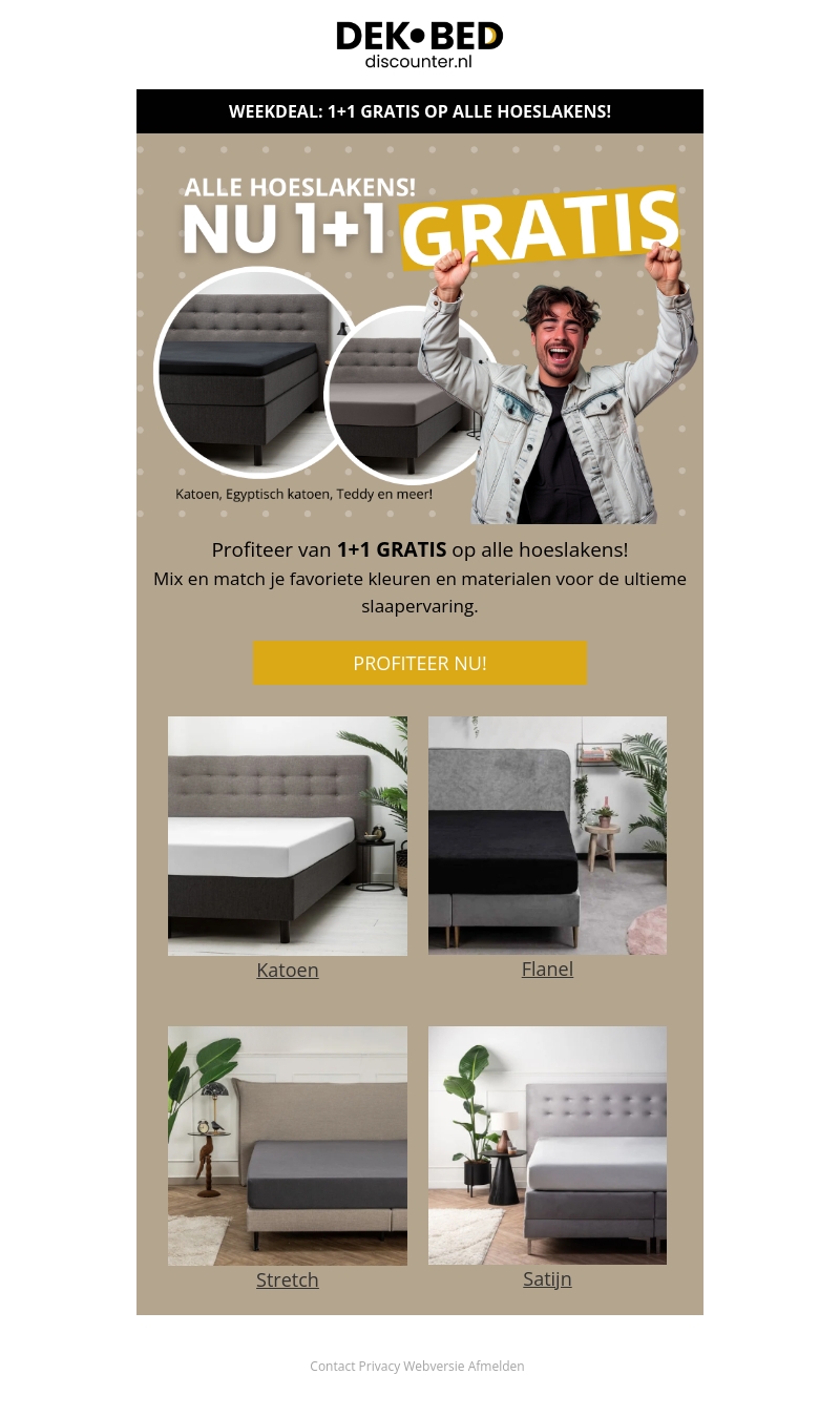 Wekelijkse aanbieding bij Dekbed-discounter.nl: ontvang 1+1 GRATIS op alle hoeslakens. Mix en match je favoriete kleuren en materialen zoals katoen, Egyptisch katoen, Teddy, en meer voor de ultieme slaapervaring. Profiteer nu!