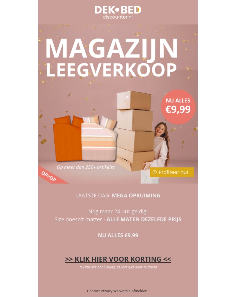 Dit is je laatste kans om te profiteren van de mega opruiming bij DEK-BED Discounter! Alle maten zijn nu slechts β¬9,99. Wees er snel bij, want de sale duurt nog maar 24 uur.