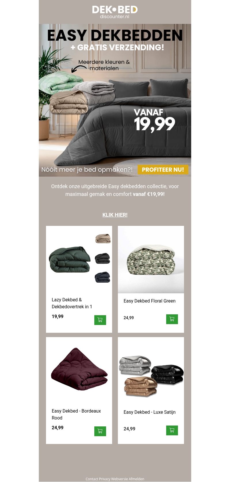 Ontdek nu de slimme slaapinnovatie met Easy dekbedden. Deze dekbedden zijn beschikbaar in diverse kleuren en materialen voor maximaal gemak. Nooit meer je bed opmaken met de praktische combinaties. Geniet van comfort en eenvoud vanaf slechts β¬19,99. Profiteer van de gratis verzending en transformeer je slaapervaring.