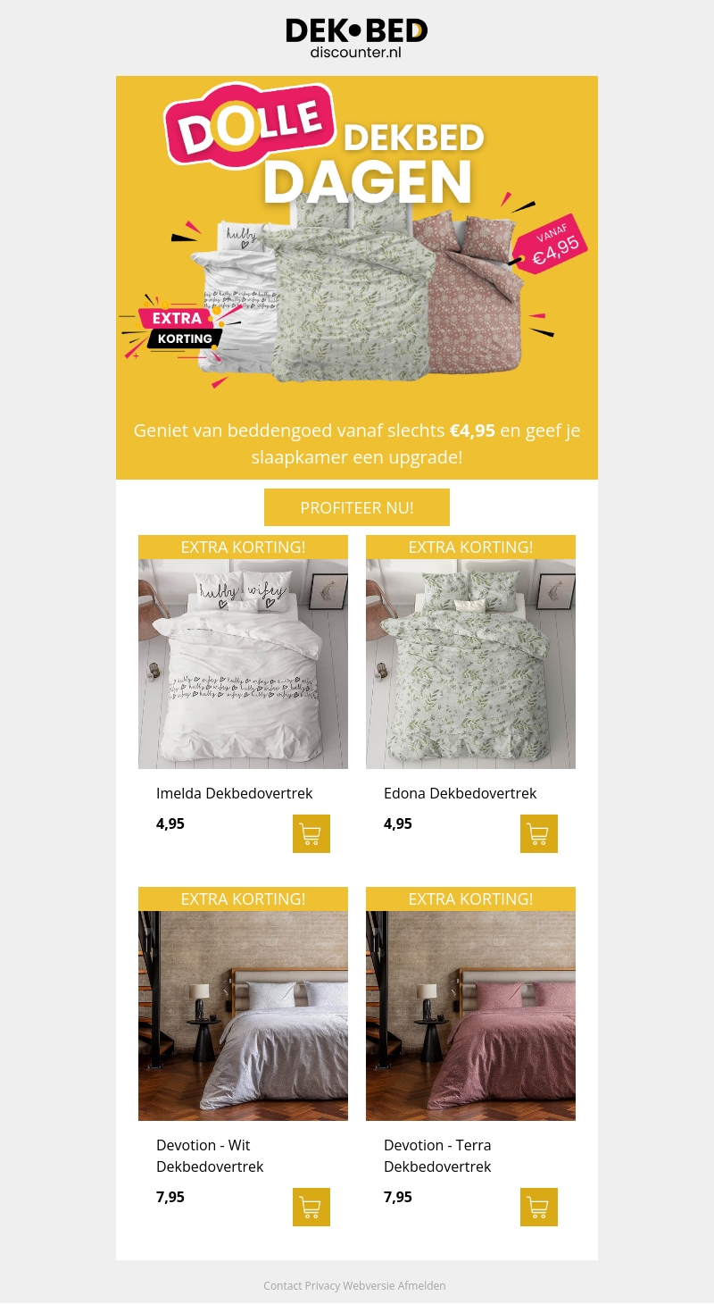 Mis de Dolle Dekbeddagen van Dekbed Discounter niet! Geniet van prachtige dekbedovertrekken tegen ongelooflijk lage prijzen. Vanaf slechts €4,95 maak je van jouw slaapkamer een waar paradijs. Bekijk de geweldige deals en profiteer nu van extra korting.
