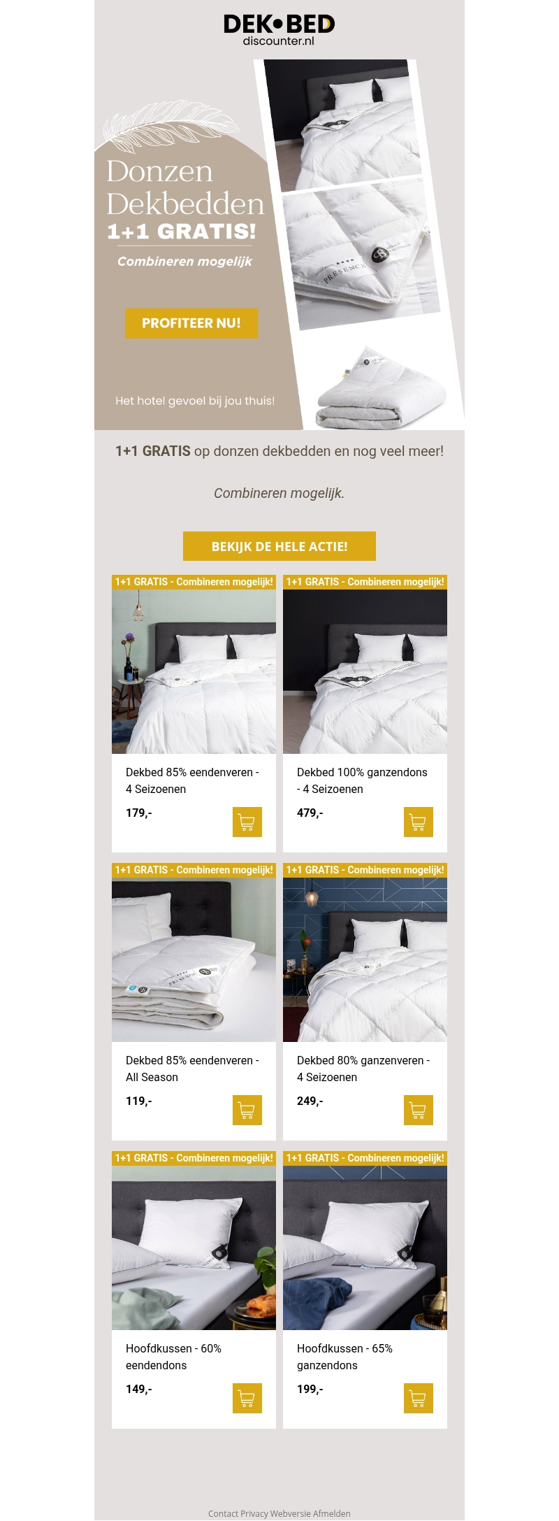 Ervaar het ultieme hotelgevoel thuis met onze donzen dekbedden. Geniet van de exclusieve 1+1 gratis aanbieding en geef uw slaapkamer een luxe uitstraling. Onze collectie biedt verschillende opties, waaronder dekbedden met eenden- en ganzendonzen vulling. Combineer naar wens en creëer uw ideale slaapomgeving. Deze actie geldt voor een beperkte tijd, mis het niet!