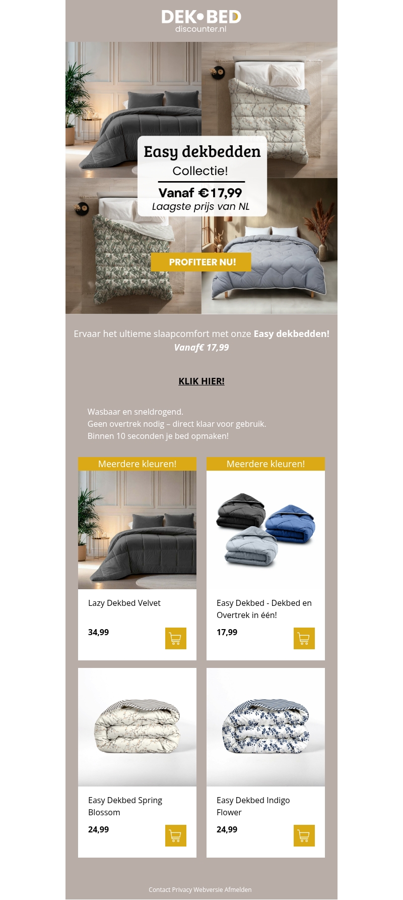 Ontdek de Easy dekbedden collectie met prijzen vanaf €17,99! Deze dekbedden zijn wasbaar, sneldrogend en direct klaar voor gebruik. Verkrijgbaar in verschillende kleuren en patronen. Haal comfort en kwaliteit in huis zonder een overtrek. Binnen 10 seconden je bed opmaken!