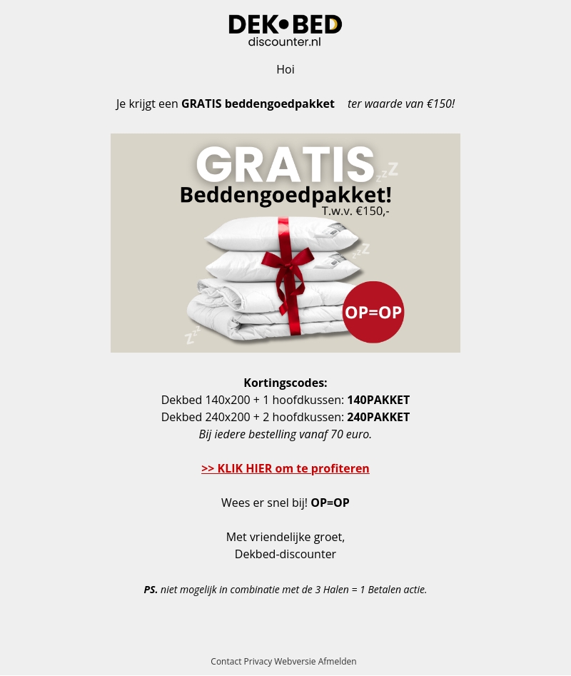 Krijg een gratis beddengoedpakket ter waarde van €150 bij Dekbed-discounter met een bestelling van €70 of meer. Mis deze aanbieding niet en gebruik de kortingscodes 140PAKKET of 240PAKKET afhankelijk van je gewenste product. Wees er snel bij want OP=OP.
