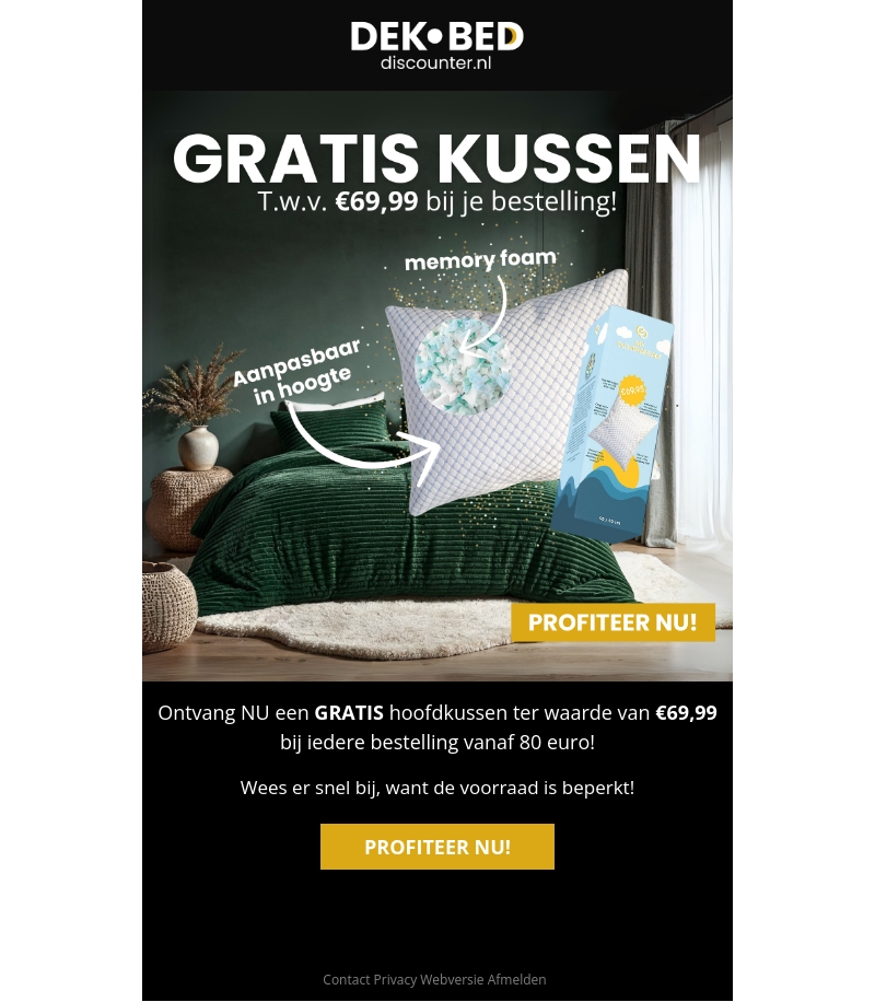 Bij Dekbed Discounter krijg je een gratis kussen met memory foam ter waarde van €69,99 bij elke bestelling vanaf €80. Dit speciale aanbod biedt comfort en aanpasbaarheid in hoogte voor een betere slaap. Wees snel, want de voorraad is beperkt! Profiteer nu van deze geweldige deal en upgrade je slaapervaring.
