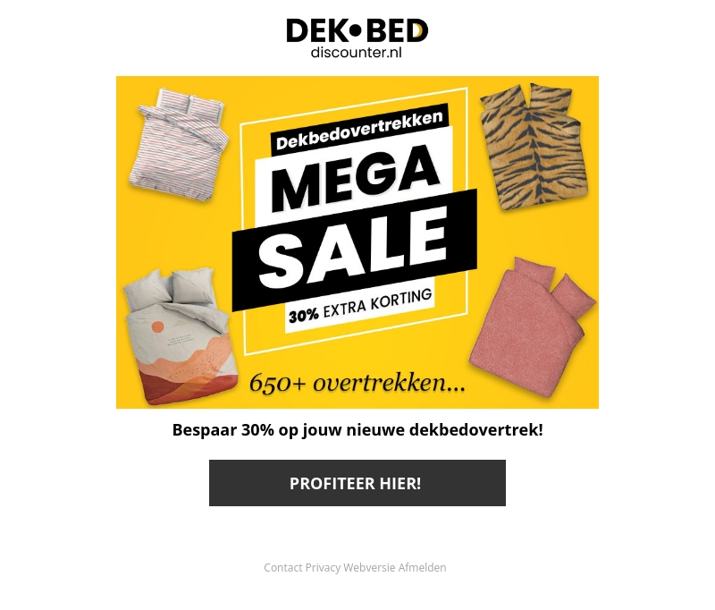 Profiteer nu van onze Mega Sale op dekbedovertrekken met 30% extra korting. Kies uit meer dan 650 stijlen en vernieuw je slaapkamer voordelig. Wacht niet te lang en bespaar op jouw favoriete dekbedovertrek bij dekbed-discounter.nl.