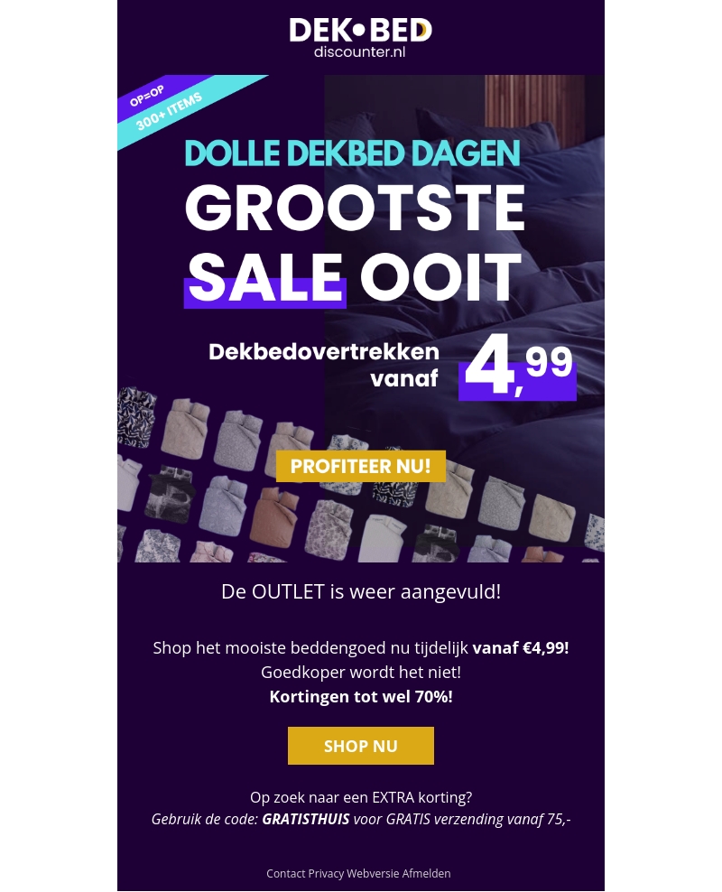 De outlet is aangevuld met de mooiste dekbedovertrekken vanaf slechts €4,99. Nu is het perfecte moment om uw collectie aan te vullen met kortingen tot wel 70%! Pak uw kans en bespaar groots!