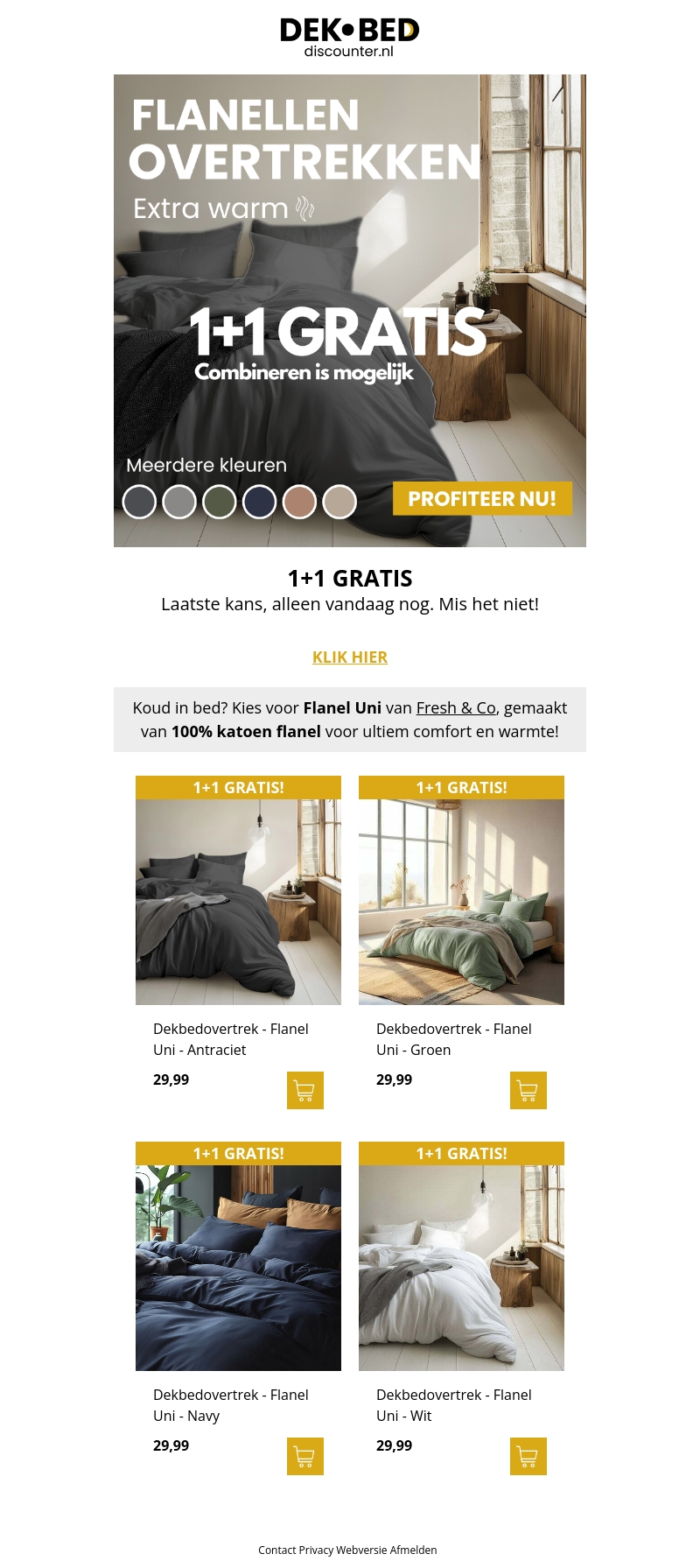 Ontdek de ultieme warmte en comfort met onze flanellen overtrekken, nu met een speciale 1+1 gratis actie. Verkrijgbaar in meerdere kleuren zoals antraciet, groen, navy, en wit. Gemaakt van 100% katoenen flanel, perfect voor de koude nachten. Deze aanbieding is alleen vandaag geldig. Profiteer nu en blijf heerlijk warm deze winter!