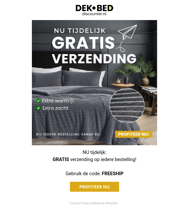 Dekbed Discounter biedt nu tijdelijk gratis verzending op alle bestellingen. Upgrade je slaapervaring met onze extra warme en zachte dekbedden. Mis de kans niet om je slaapkamer te transformeren.