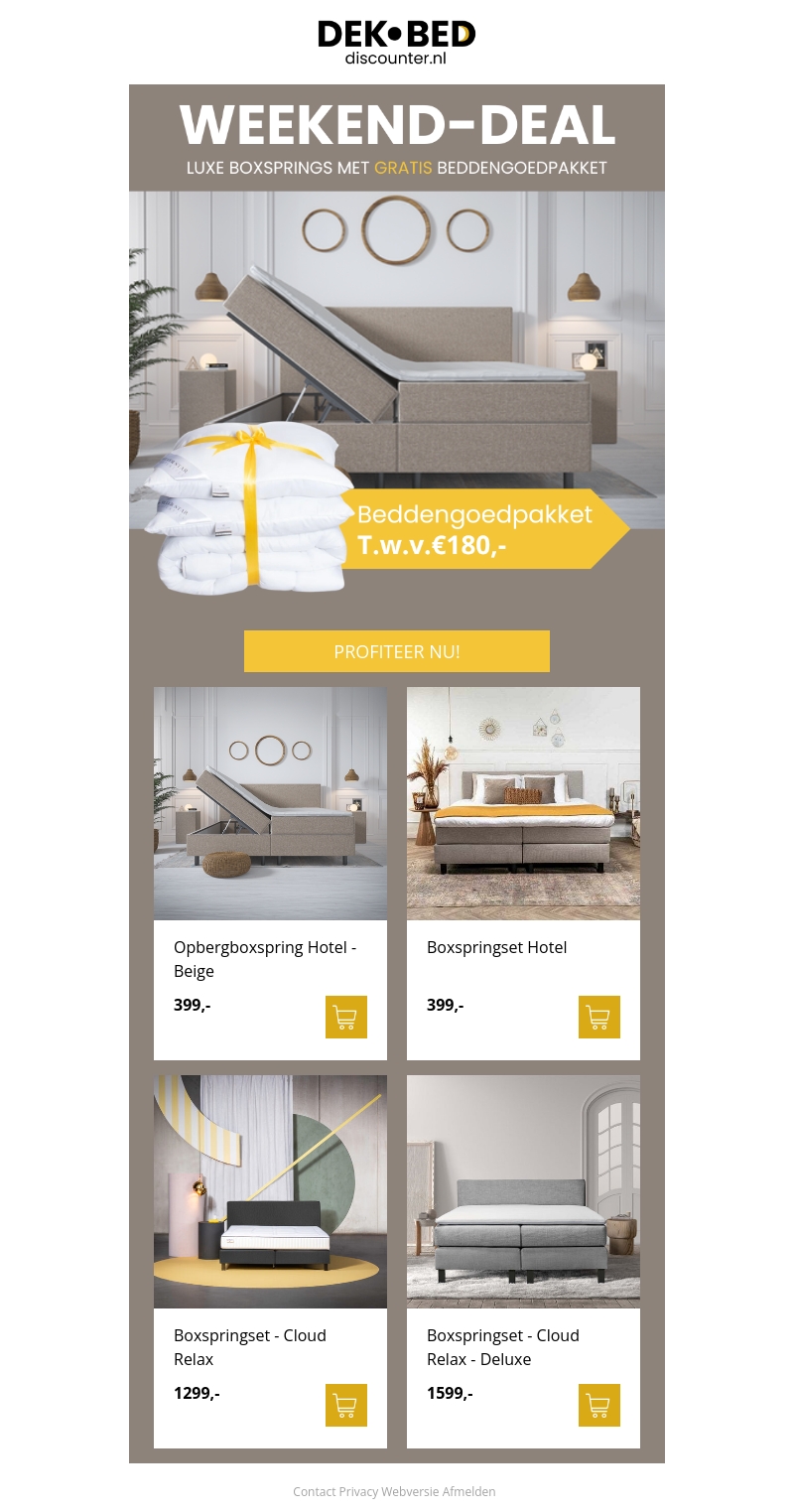 Mis deze weekend-deal niet! Bij aankoop van een luxe boxspring ontvang je een gratis beddengoedpakket ter waarde van €180,-. Kies uit verschillende stijlvolle boxspringmodellen en geniet van optimaal comfort en kwaliteit.