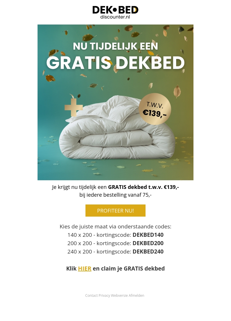 Ontvang een gratis dekbed ter waarde van β¬139 bij je bestelling vanaf β¬75! Kies uit drie verschillende maten en gebruik de bijbehorende kortingscodes. Profiteer nu van deze tijdelijke actie en zorg voor een warme en comfortabele slaapervaring.