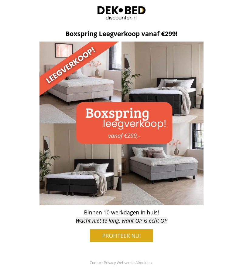Profiteer nu van de grote boxspring leegverkoop bij Dekbed Discounter. Met prijzen die beginnen vanaf slechts €299, vindt u zeker het perfecte bed om uw slaapkamer te vernieuwen. Wacht niet te lang, want OP = OP. Bestel binnen 10 werkdagen in huis en geniet van uw nieuwe boxspring.