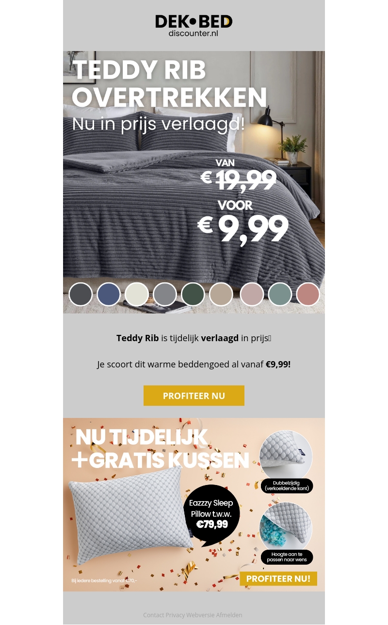 Het Teddy Rib beddengoed is tijdelijk in prijs verlaagd. Nu verkrijgbaar vanaf slechts €9,99! Voor elke bestelling boven €70, krijg je ook een gratis Eazzzy Sleep kussen ter waarde van €79,99. Mis deze kans niet om jouw slaapcomfort te verbeteren met deze geweldige aanbiedingen.