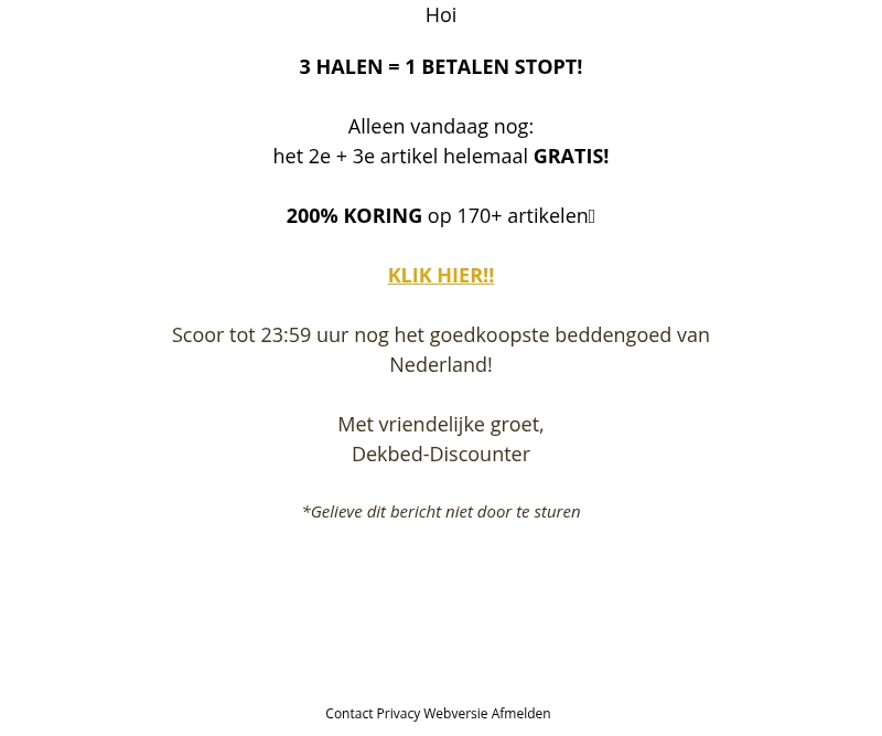 Vandaag stopt de 3 halen = 1 betalen actie bij Dekbed-Discounter. Grijp je kans en scoor tot 23:59 uur het goedkoopste beddengoed van Nederland. Het tweede en derde artikel krijg je helemaal gratis, met 200% korting op meer dan 170 artikelen. Klik snel en mis deze unieke gelegenheid niet. Met vriendelijke groet, Dekbed-Discounter.