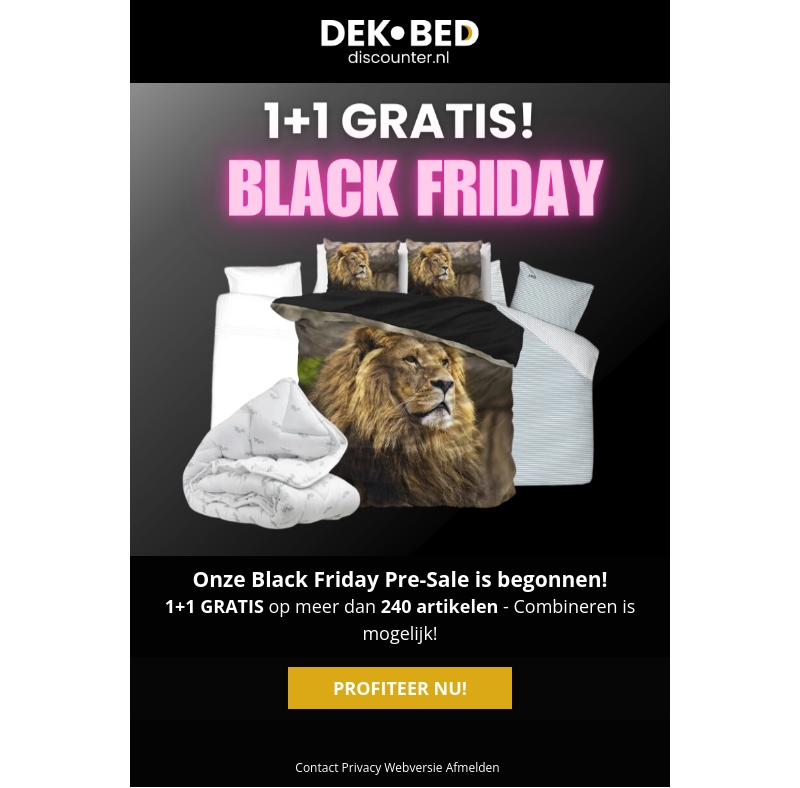 Ontdek de sensationele Black Friday Pre-Sale van DEK BED. Profiteer van een 1+1 gratis actie op meer dan 240 artikelen. Combineer en bespaar op je favoriete beddengoed. Mis het niet en doe mee met de meest voordelige deals van het jaar!