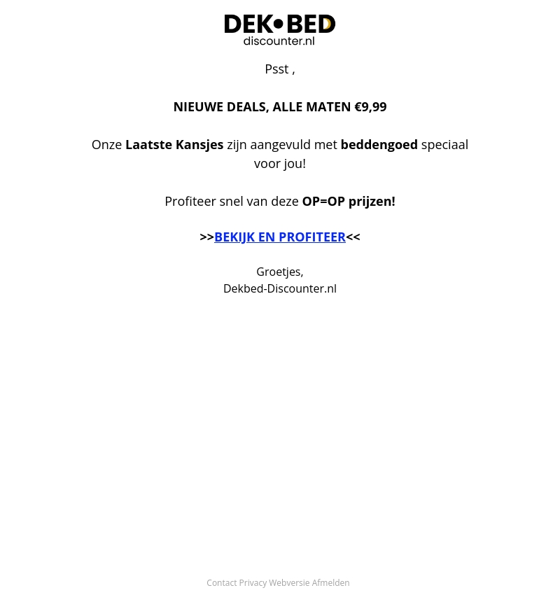 Psst... We hebben nieuwe deals voor jou! De laatste kansjes zijn nu aangevuld met beddengoed in alle maten voor slechts €9,99. Profiteer snel van deze OP=OP prijzen en bekijk ze nu via de link. Groetjes, Dekbed-Discounter.nl