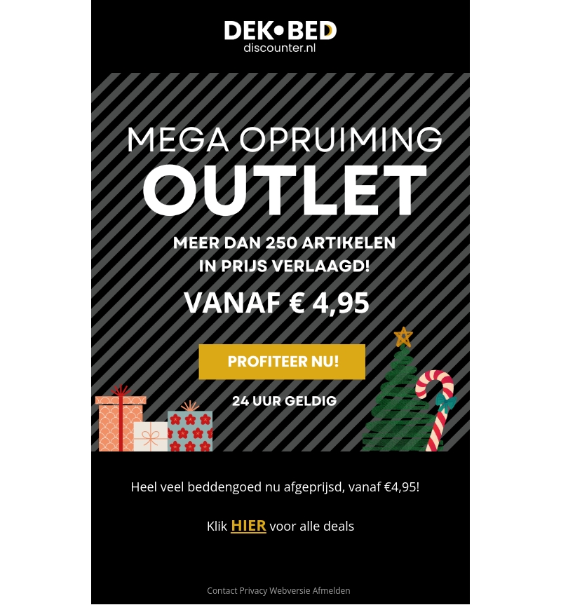 Ontdek de geweldige kerst outlet bij Dekbed Discounter. Meer dan 250 artikelen zijn nu in prijs verlaagd, met beddengoed vanaf slechts €4,95! Mis deze kans niet, want de deals zijn maar 24 uur geldig. Ervaar grote kortingen op een breed scala aan producten. Bezoek onze website en shop de beste kerstdeals!