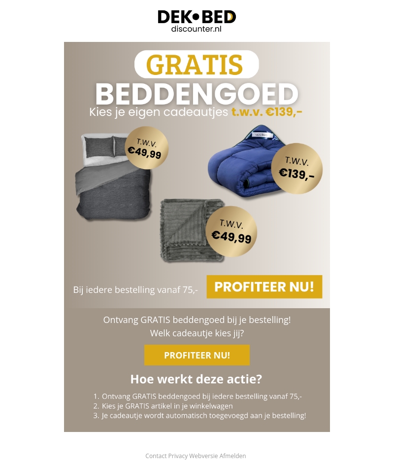 Ontvang nu gratis beddengoed bij je bestelling vanaf €75 bij Dekbed Discounter. Kies je eigen cadeautje ter waarde van €139. Profiteer snel van deze unieke actie en geef je slaapkamer een frisse look zonder extra kosten.